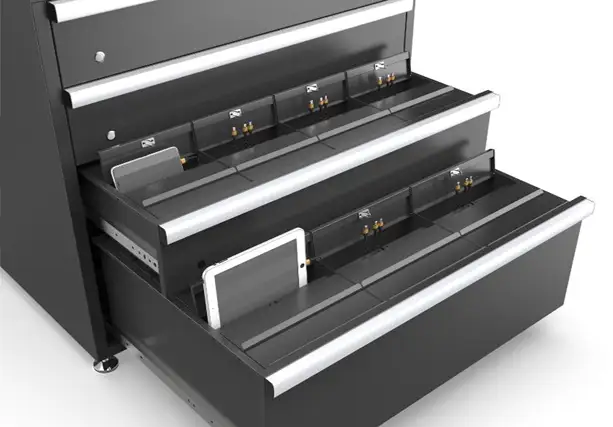 Each storage compartment in a drawer has individual charging capability for electronic devices, allowing technicians to use immediately with no wait times.